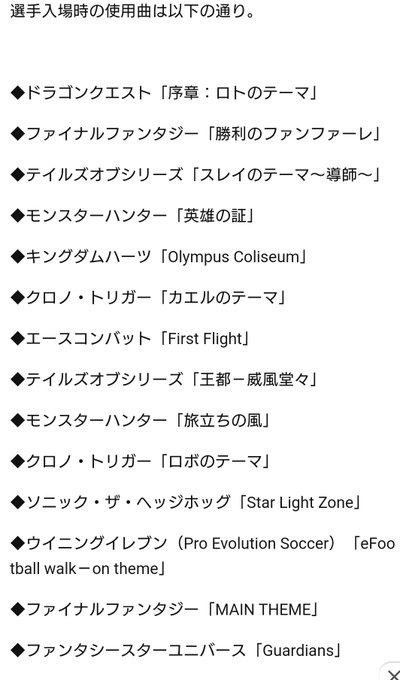 8felkcqa6gcwhm from img.topics.smt.news.goo.ne.jp Mutyunのゲーム+α ブログがお送りします。 id:5lt8u9rqaドラクエ、ff、モンハン日本生まれのゲーム音楽で選手入場/使用曲一覧選手入場時の使用曲は以下の通り。 ドラゴンクエスト「序章:ロトのテーマ」 ファイナルファンタ >開会式の入場行進曲、「ドラクエ」テーマ曲か 同じ曲をリピートで何回も流すはずがなく ほんの数分だけじゃん 77 名無しさん@恐縮です 2021/07/22(木) 16:10:26.77 id:crevxj5u0 If playback doesn't begin shortly.